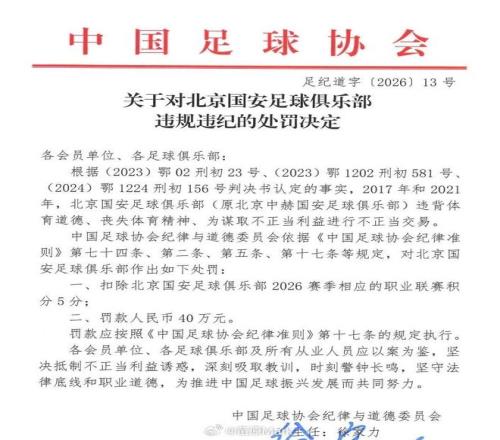 周四,中国足协正式公布受处罚俱乐部名单。北京国安被罚5分、罚款40万,博主清蒸树袋熊质疑道,“咱不能揣着明白...
